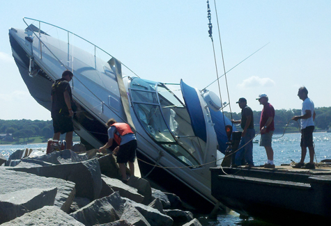 SeaTow of Southold and Costello Marine Contracting of Greenport lifted the boat, which had become impaled on a boulder, patched it and brought it Brewer’s Yacht.