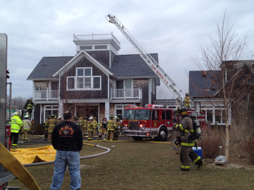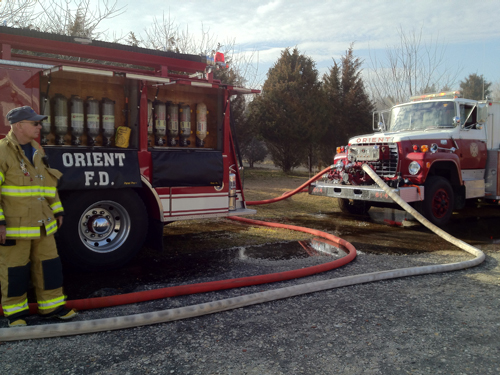The fire broke out in the Ozolins family’s garage early Monday afternoon. Alerted by the family, the Orient FD requested, and received, assistance from all North Fork fire departments from Mattituck east. At least 55 volunteers responded with about 24 tankers and other fire apparatus, chief Wysocki said.