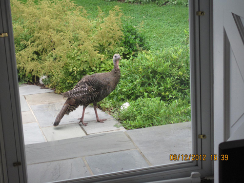 A wild turkey trolling through a Southold neighborhood found one home particularly inviting Sunday. JoAnn Jahncke and her husband Richard noticed the turkey casually hanging outside their home from about 6 a.m. to 3 p.m. Sunday.