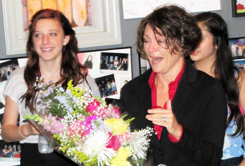 GRANT PARPAN PHOTO | Mary Motto Kalich was presented with flowers at the reception celebrating The North Fork Community Theatre’s purchase of its longtime playhouse. Ms. Motto Kalich chaired the group’s fundraising efforts, which exceeded $500,000 in less than four years.