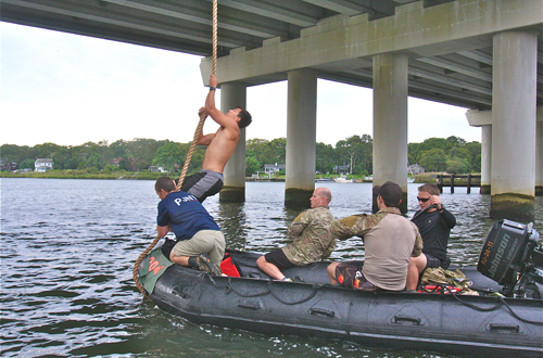 They headed out on the Peconic River to the County 105 bridge propelled only by paddle, since it’s a no-wake zone. Once there, a designated PJ had to climb a 30-foot rope to the top of the bridge and record his time. After that, the teams headed to Greenport, powered by a 30-horsepower motor.