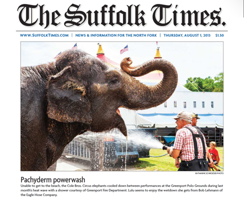 After all the articles and protests, one in a torrential downpour in Greenport, against the use of animals in circuses, we get a front page photo of an elephant being hosed down by a benevolent fireman in the Aug. 1 issue of The Suffolk Times.