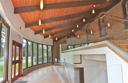 The addition to the structure — which was built in 1946 — was built around the exterior wall of the original building, meaning the windows that once faced out of the sanctuary were left facing the new stairs and elevator.