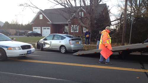 The woman, driving a Honda Accord, was making a left out of Herricks Lane when she collided with a Toyota Prius heading westbound on Main Road about 2:45 p.m., police said. Traffic was briefly blocked going westbound.