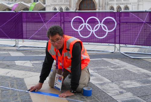 Photo Caption: David Katz taping down a blue line, marking the marathon route for the 2012 London Olympic Games. (Credit: courtesy)