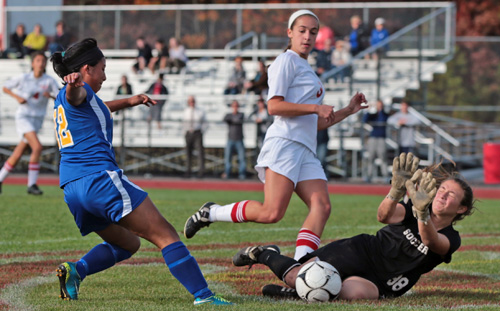 Photo Caption: Mattituck’s Elvira Puluc tries to get a foot on the ball, only to be thwarted by Center Moriches goalkeeper Megan Ricci. (Credit: Daniel De Mato)