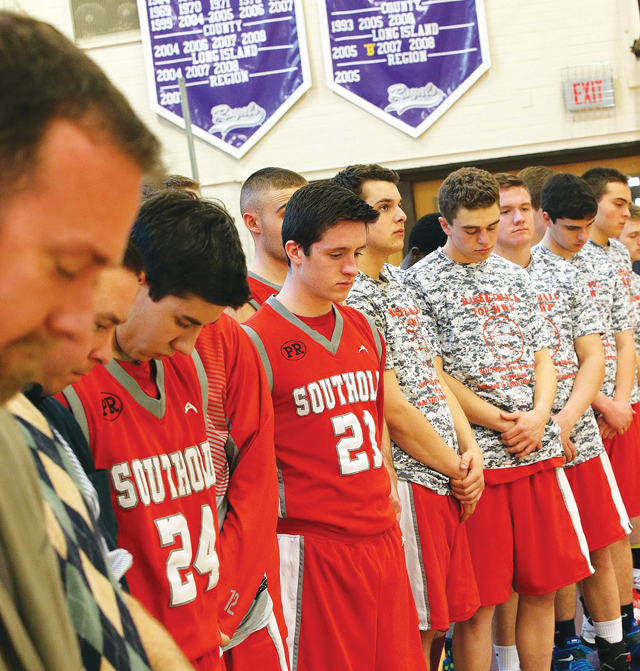 Photo Caption: Southold players and coaches bow their heads during a moment of silence before the First Settlers’ game at Port Jefferson Tuesday. (Credit: Garret Meade)