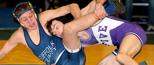 Photo caption: Mattituck/Greenport/Southold sophomore Jack Bokina, wrestling in the 113-pound weight class, took fourth place in Division II for the second straight year. (Credit: Ray Nelson)