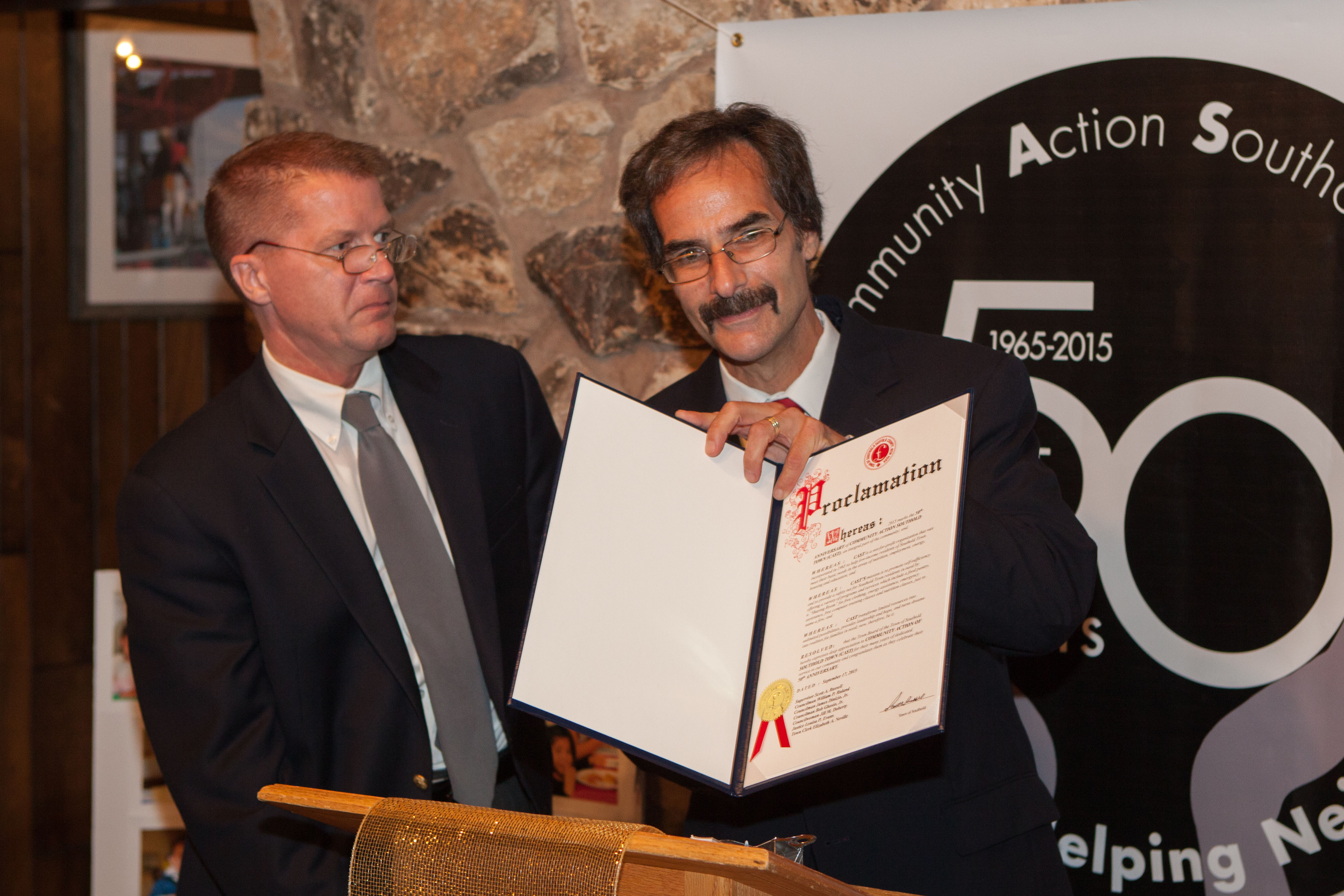 Photo: Southold Town Supervisor Scott Russell presents CAST president Denis Noncarrow with a proclamation in September honoring CAST’s 50th anniversary. (Credit: Katharine Schroeder, file)