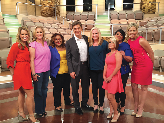 Photo: BodyRite owner Paige Romanowski (from far right) and her clients Camile Rieneck of Cutchogue and Rebecca Neese of New Suffolk filmed an episode of ‘The Dr. Oz Show’ last week. They’re pictured with Dr. Mehmet Oz and other guests. (Credit: Courtesy photo)