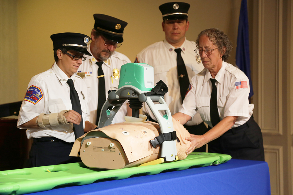 At a public demonstration Friday evening, Greenport Fire Department volunteers showed how they use a LUCAS automatic CPR machine that can autonomously deliver consistent chest compressions, freeing up volunteers to do other life-saving work on the patient.