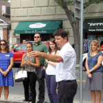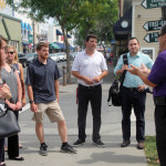 While on the last stop of the tour, Front Street, Mr. Golden pulled two high school students who were working at local restaurants — his daughter Jillian Golden and Jules Atkins — to say hello to their new teachers.