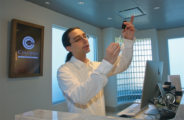 File photo: Columbia Care assistant general manager Christian Shilling demonstrates how a tincture bottle measures a dose of medicine. (Credit: Barbaraellen Koch)