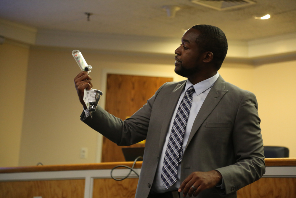 Photo caption: Tyrand Fuller, lead hydrogeologist for the Suffolk County Water Authority, holds up a faucet aerator and shower head that reduces water use at a meeting at Southold Town Hall.