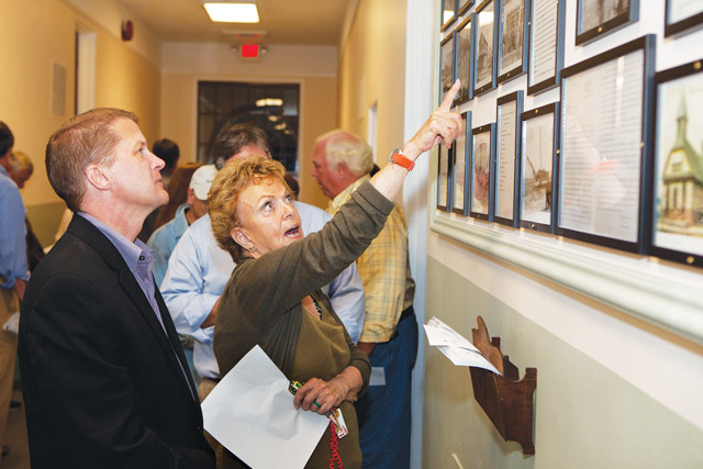 Top file photo: Southold Town historian Antonia Booth and Supervisor Scott Russell discuss the historical photo display at the grand opening tour of the new Peconic Lane Community Center on Sept. 26, 2011. (Credit: Katharine Schroeder)