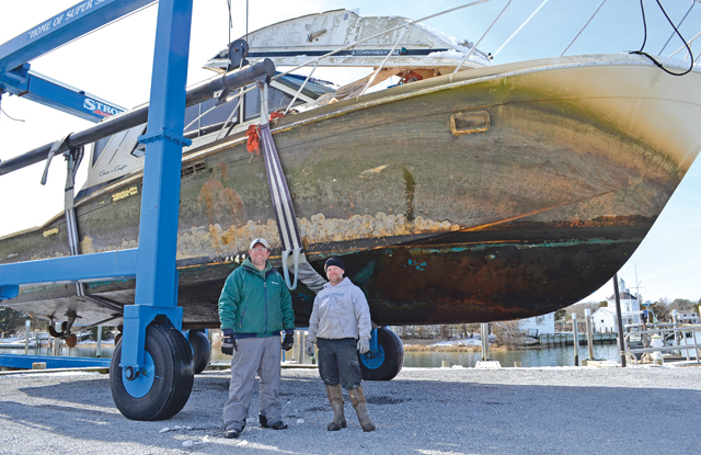 Top photo: Rich Petrowski (left) and Tim Hough with the Tribeca Too Monday after it was pulled from the water at Strong’s Marine in Mattituck. (Credit: Kelly Zegers)