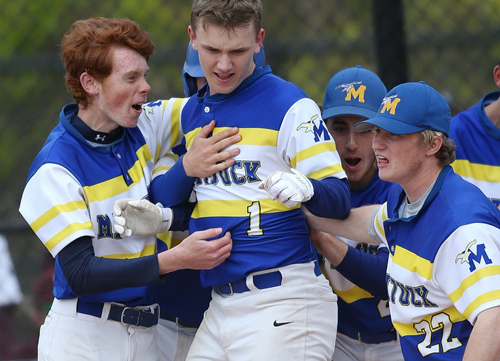 Photo caption: Bryce Grathwohl is mobbed by teammates after his 19th-inning home run gave Mattituck a 5-4 lead over Southampton. (Credit: Garret Meade)
