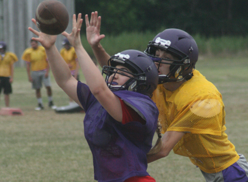 Photo caption: Felecia Kayel, a sophomore on the Greenport/Southold/Mattituck junior varsity football team, reaches out for a pass during Friday morning’s practice. (Credit: Bob Liepa)