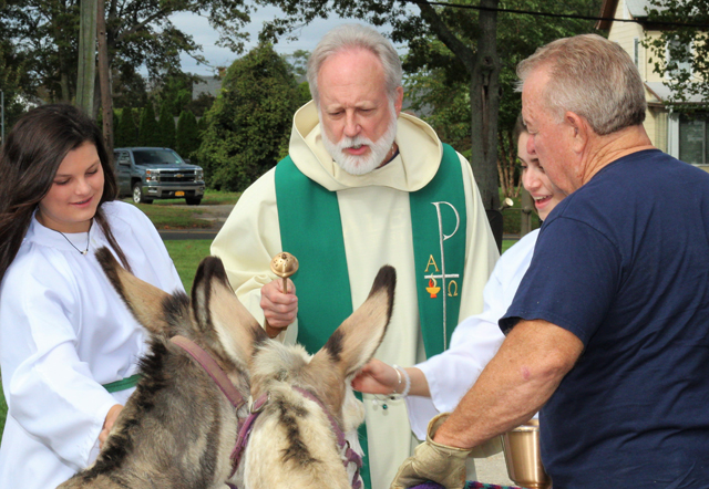 Top photo: Donkeys Lilly and Poppy received a blessing Sunday from Monsignor Joseph Staudt. (Credit: Elizabeth Wagner)