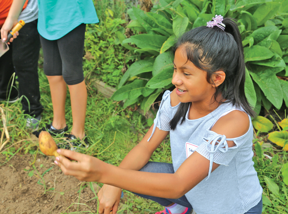 Top photo caption: Odaliz Monzon, 10, harvests a potato last Wednesday from the learning garden at Peconic Land Trust’s agricultural center in Southold. (Credit: Rachel Siford)
