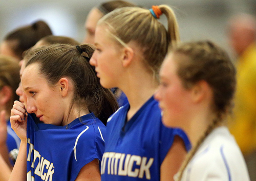 Photo caption: From left, Mattituck’s Cassidy Bertolas, Dominique Crews and Jordan Osler during a postmatch ceremony after losing their first Suffolk County Class B final. (Credit: Garret Meade)