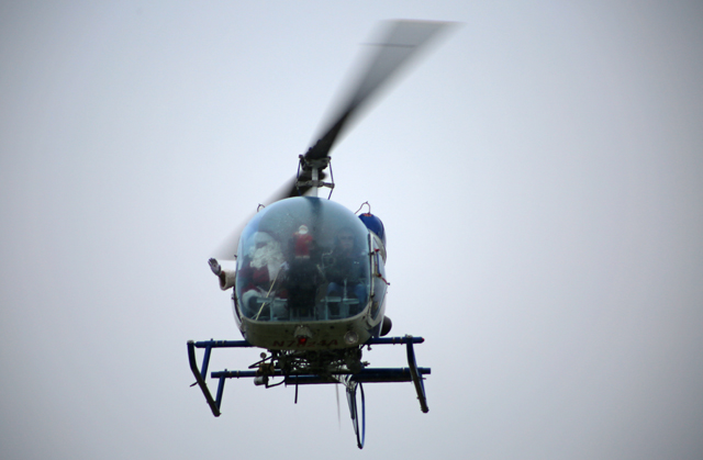 Santa Claus made his annual helicopter landing in Cutchogue Saturday, pleasing dozens of families who lined up for the event despite a light snow and cold temperatures.