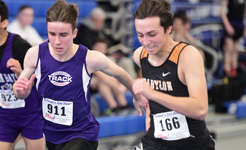 Photo caption: Greenport/Southold’s Max Pasko, left, is nipped at the finish line by Babylon’s Evan Parise in the 55-meter dash final. (Credit: Robert O’Rourk)
