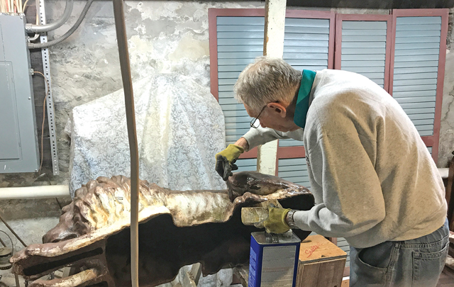 “I want Greenport to see them again,” he said as he stood in the low-ceilinged basement, where the two lions lay on their sides on sawhorses in front of him. A can of paint stripper and a package of steel wool pads sat on the sawhorses. They are his tools for the slow process of peeling away years of paint on the statues.