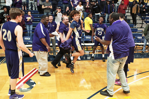 Photo caption: Jaxan Swann does a victory dance following Greenport’s win over Alexander Hamilton in a regional final Saturday. (Credit: Ray Nelson, file)