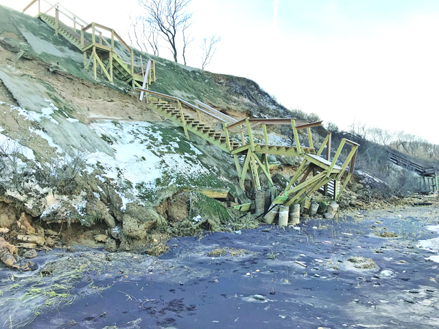 The early January nor’easter that battered the North Fork not only ate away at Long Island Sound beaches, but ripped up waterfront structures, including as a $50,000 staircase along the bluff in Peconic that had stood for only 90 days.