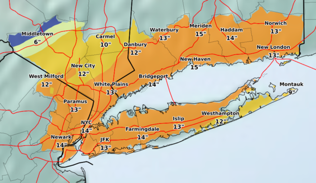 New York City, northeast New Jersey, the Lower Hudson Valley, and southwestern Connecticut could see as much as 12 to 15 inches.