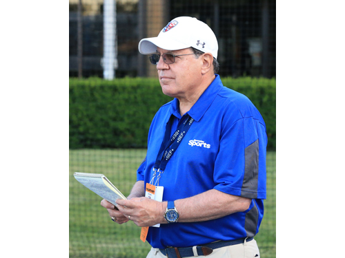 Photo caption: Bob Herzog on the sideline Friday evening at Hofstra University’s James M. Shuart Stadium, covering his final game for Newsday. (Credit: Daniel De Mato)
