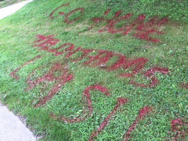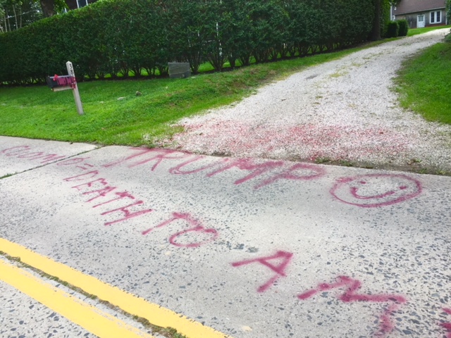 Neighbors saw the name “Trump” sprayed on the roadway and mailbox of the home during a morning walk. The sign appeared damaged and a tire track in the mud nearby suggested a car may have run into it. On the roadway, “Cuomo = Death to America,” and on the homeowner’s lawn, “Go home” with another indistinguishable message.