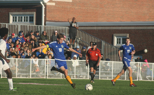 Photo caption: Mattituck junior forward Jack Burkhardt delivering a cross in the first half against Pierson/Bridgehampton. (Credit: Bob Liepa)