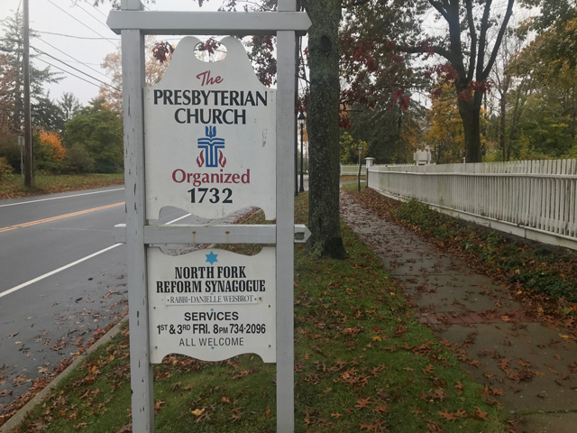 For the Presbyterian and Jewish congregations, this is now home, a shared space that feels historic to both groups. On Friday night, in response to events in Pittsburgh, a Southold Town police officer stood by the entrance.