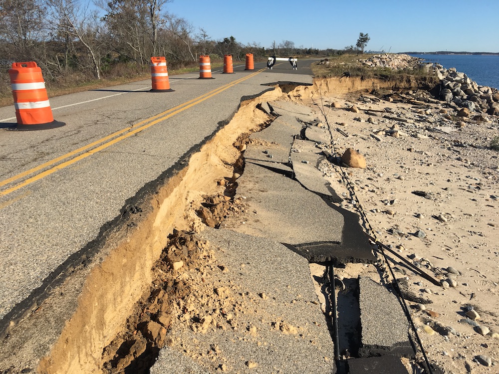 Photo caption: A portion of the access road to Orient Beach State Park was destroyed in an October storm. (Kate Nalepinski photo)