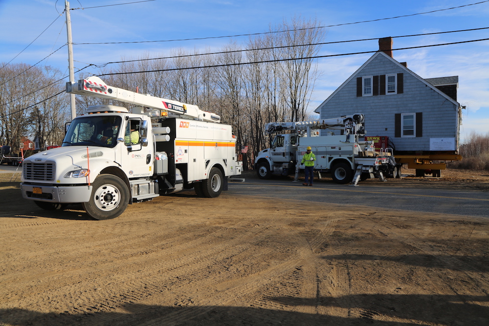 Crews from PSEG, Optimum and Verizon gathered at the site just north of Charnews Farm around 8:30 a.m. to slowly lift and lower four utility wires to make a path for the Case House. Just before 10:30 a.m., the team from Dawn Movers glided the house across the road on a hydraulic dolly to the delight of Peconic Land Trust staff who had braved the 17-degree temperature to witness the move.