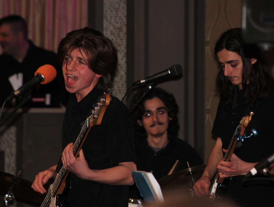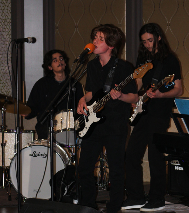 Brothers Brown perform an original composition, “Frame of Mind,” with Gage Brown-DeVirgilio on bass and vocals, Rowan Brown-DeVirgilio on drums, and Tristen Brown-DeVirgilio on electric guitar (all of Middle Island). (Credit: Elizabeth Wagner)