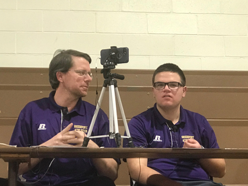 Photo caption: Play-by-play announcer Kevin Webster, left, and color commentator Tommy Tsavaras working a boys basketball game at Greenport High School. (Credit: courtesy photo)