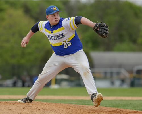 Photo caption: Tyler C. Olsen fired seven strikeouts in four scoreless innings in his first relief appearance of the season for Mattituck. (Credit: Daniel De Mato)