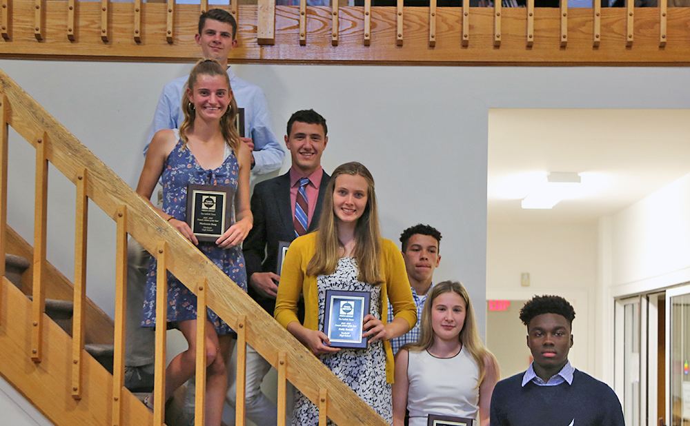 Photo caption: The Suffolk Times Athletes of the Year: (from left) Ryan Seifert, Mackenzie Hoeg, Max Kruszeski, Emily Russell, Jaxan Swann, Jillian Golden and Ahkee Anderson. (Credit: Joe Werkmeister)