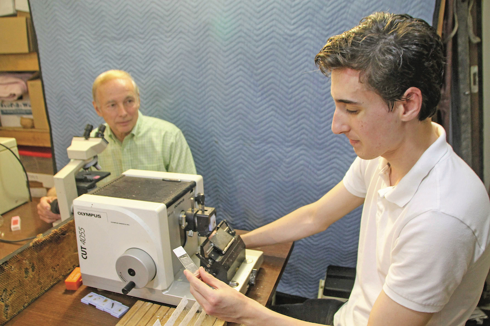 Photo caption: Joe McInnis works on his bee research project with his mentor, retired Plum Island veterinary pathologist Doug Gregg. (Ericka Peters photo)