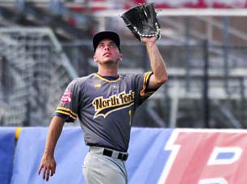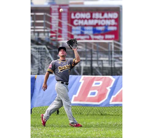 Photo caption: North Fork centerfielder Joe Tardif, who plays for SUNY/Cortland, where it’s awfully cold in the early spring, said playing in the extreme heat is “tough, but I’d definitely rather this than 15 degrees up at school.” (Credit: Bill Landon)