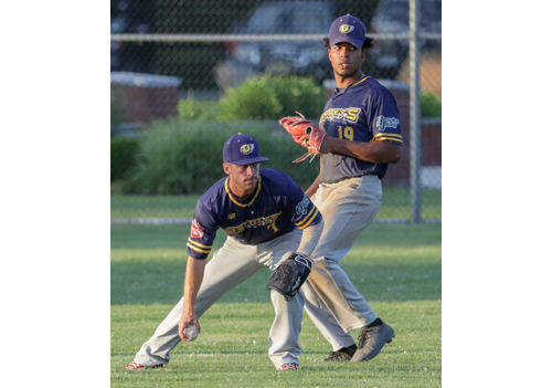 Photo caption: Joe Tardif fielding a ball in centerfield while being backed up by Isaac Deveaux. (Credit: Daniel De Mato)