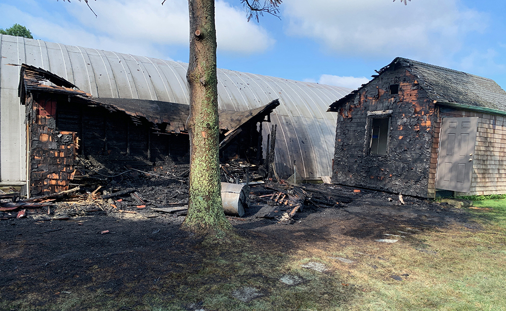 Photo caption: The fire destroyed one small shed and damaged a second. (Courtesy photo)