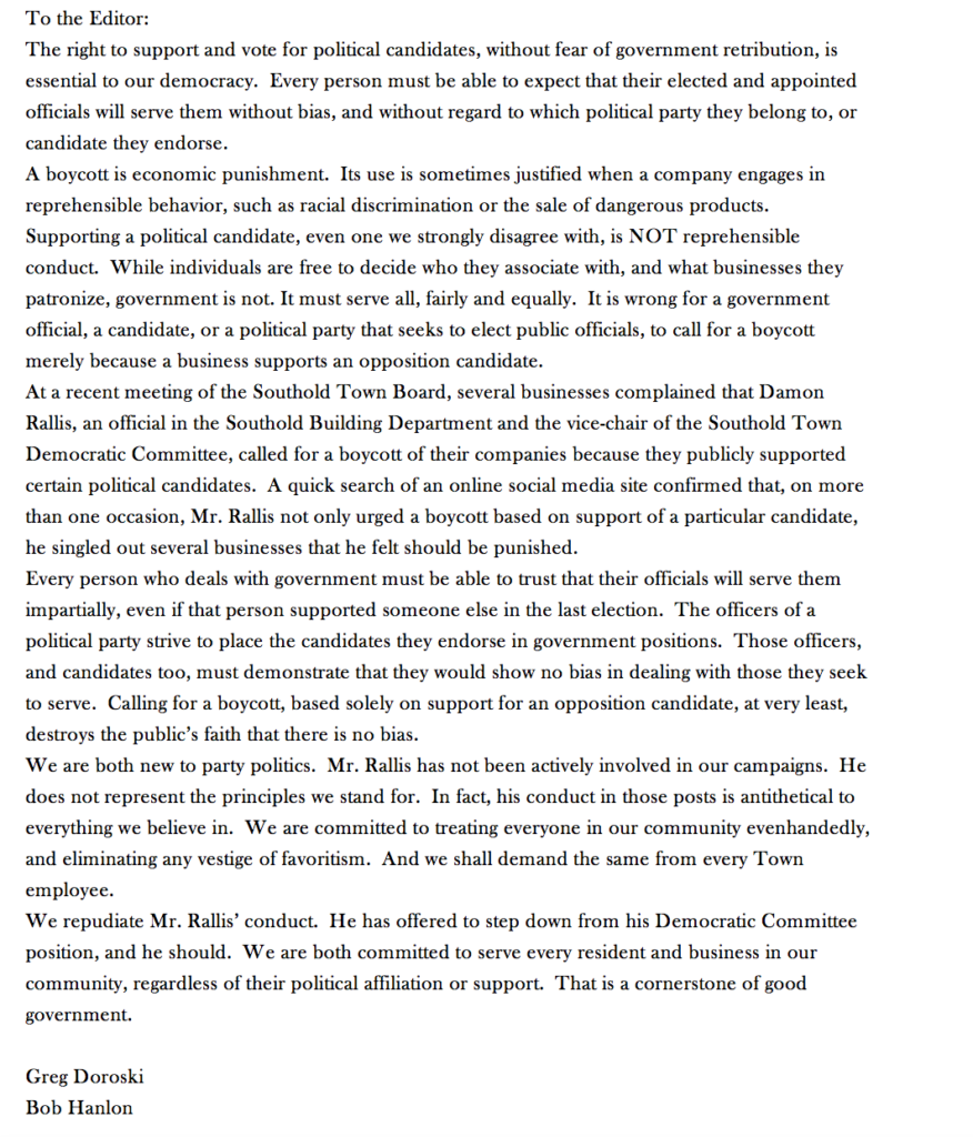 At the meeting, Southold Town Supervisor Scott Russell, a Republican who was opposed by Mr. Rallis in the 2015 election, said he was concerned that a Democratic Party official who has discretionary authority in town government would be calling for boycotts of businesses because they support candidates he does not agree with. This, he said, has a negative impact on the integrity of government.