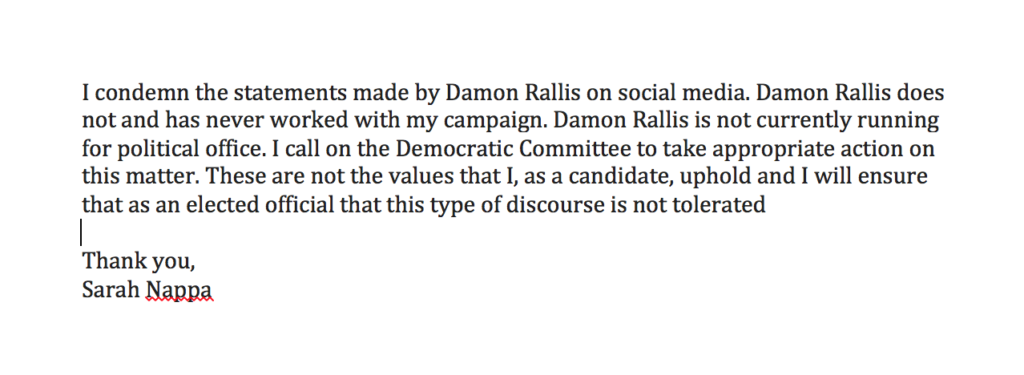 Mr. Russell urged the Democratic Party leadership and candidates to publicly condemn Mr. Rallis’ behavior.