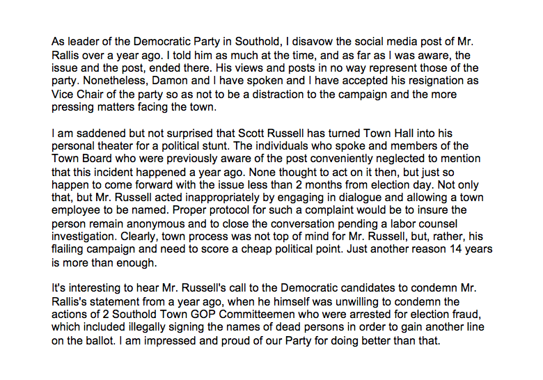 While Ms. Quigley stated that she did not support Mr. Rallis’ Facebook comments, she also criticized the events of Tuesday’s meeting. In her email she called the testimony of the two businessmen and town board members “personal theater” and a “political stunt.” She said Mr. Russell acted “inappropriately by engaging in dialogue and allowing a town employee to be named.”