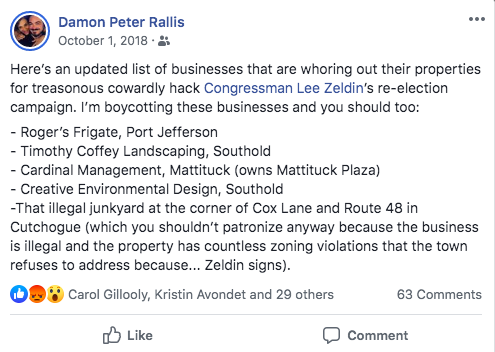 He read a portion of Mr. Rallis’ year-old Facebook post that says: “Here’s an updated list of businesses that are whoring out their properties for treasonous cowardly hack Congressman Lee Zeldin’s re-election campaign. I’m boycotting these businesses and you should too.” That comment was made about a month before the 2018 Congressional election.