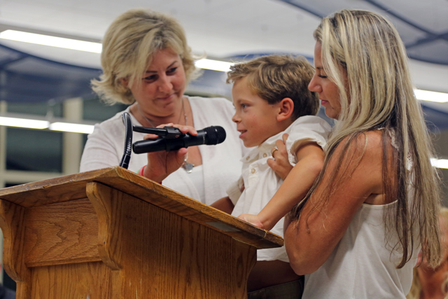 Caption: Aquebogue Elementary School teacher Keri Stromski (left) and Kristen Kramer lift Ms. Kramer’s son to the microphone at last Tuesday’s Riverhead school board meeting. Ms. Stromski and nearly 30 others attended the meeting to express their frustration with new state legislation that abolishes religious exemption from school vaccinations.